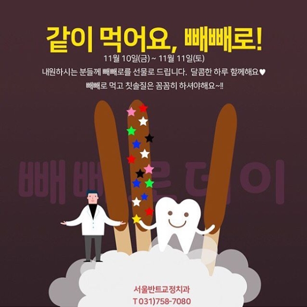 <<서울반트교정치과 11월 이벤트>>짜잔~~11월 11월 빼빼로데이를 함께 보내고 싶어 이벤트를 준비했습니다 :)11월10일(금요일)~11월11일(토요일) 내원하시는 분들께빼빼로를 선물로 드립니다!달콤한 하루 함께해요